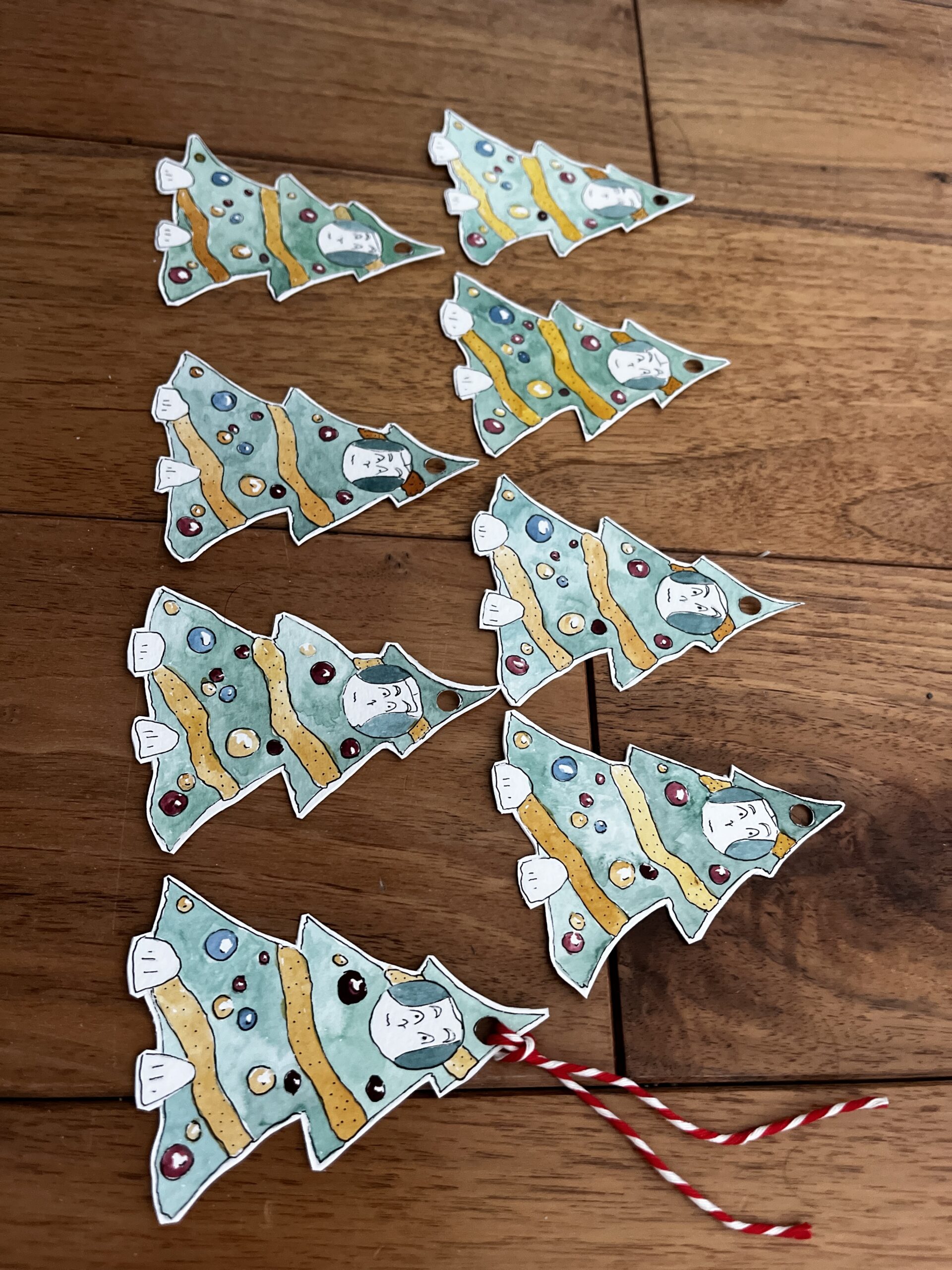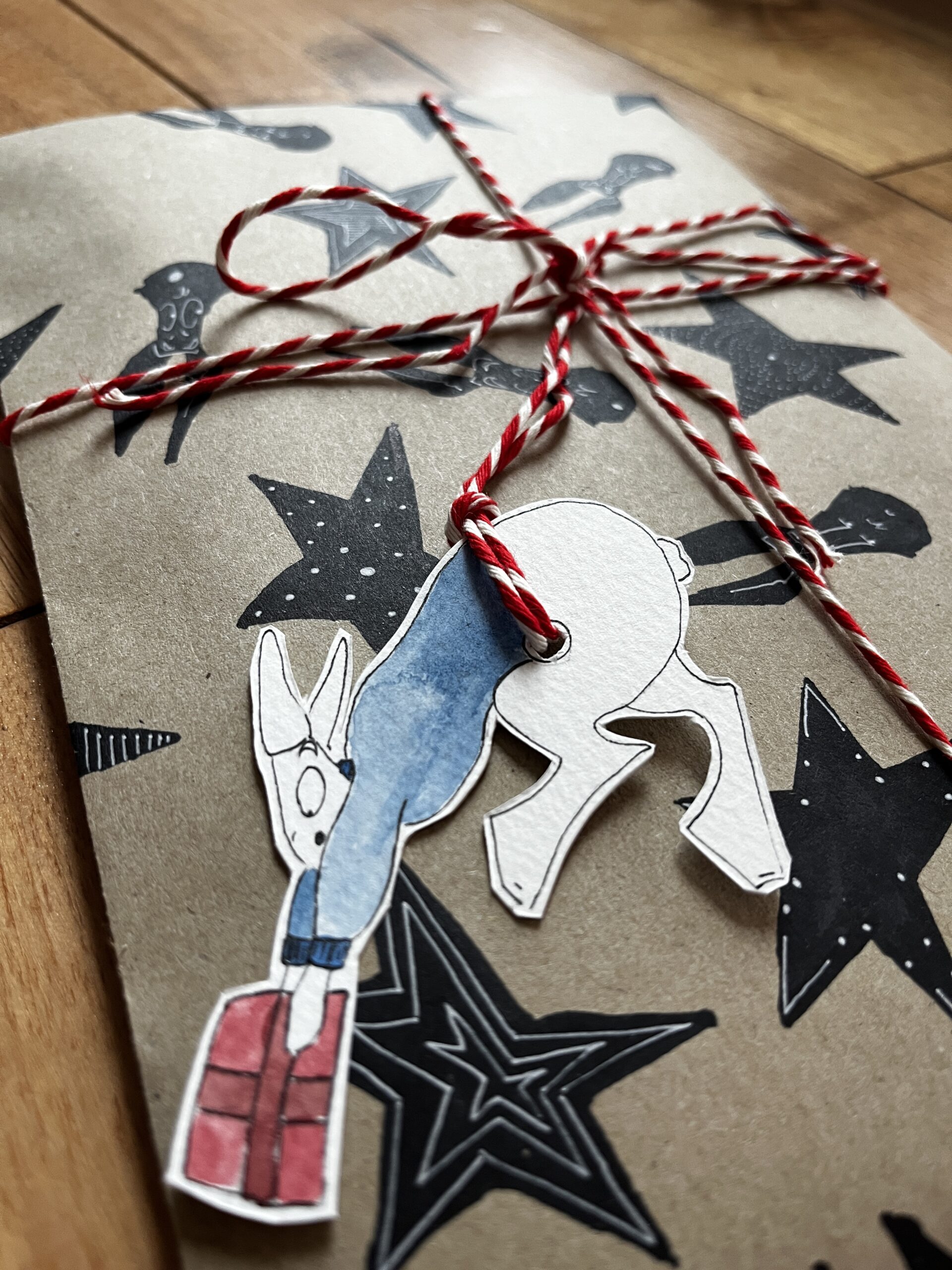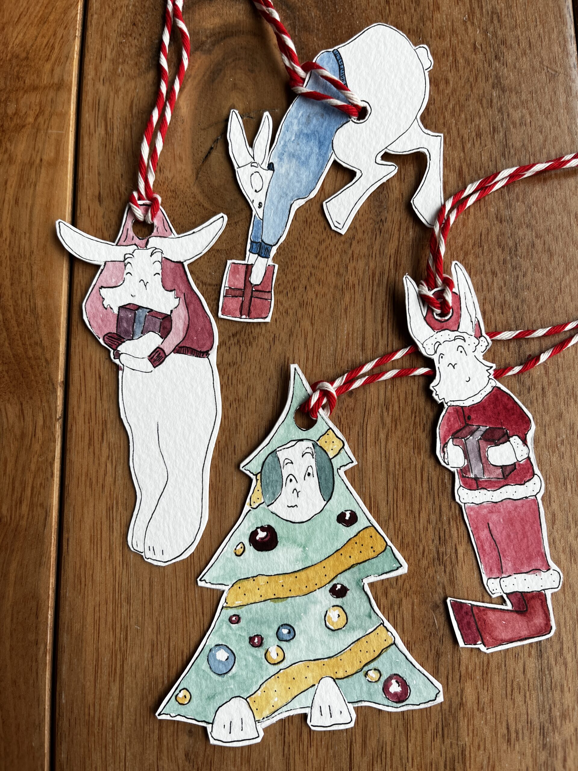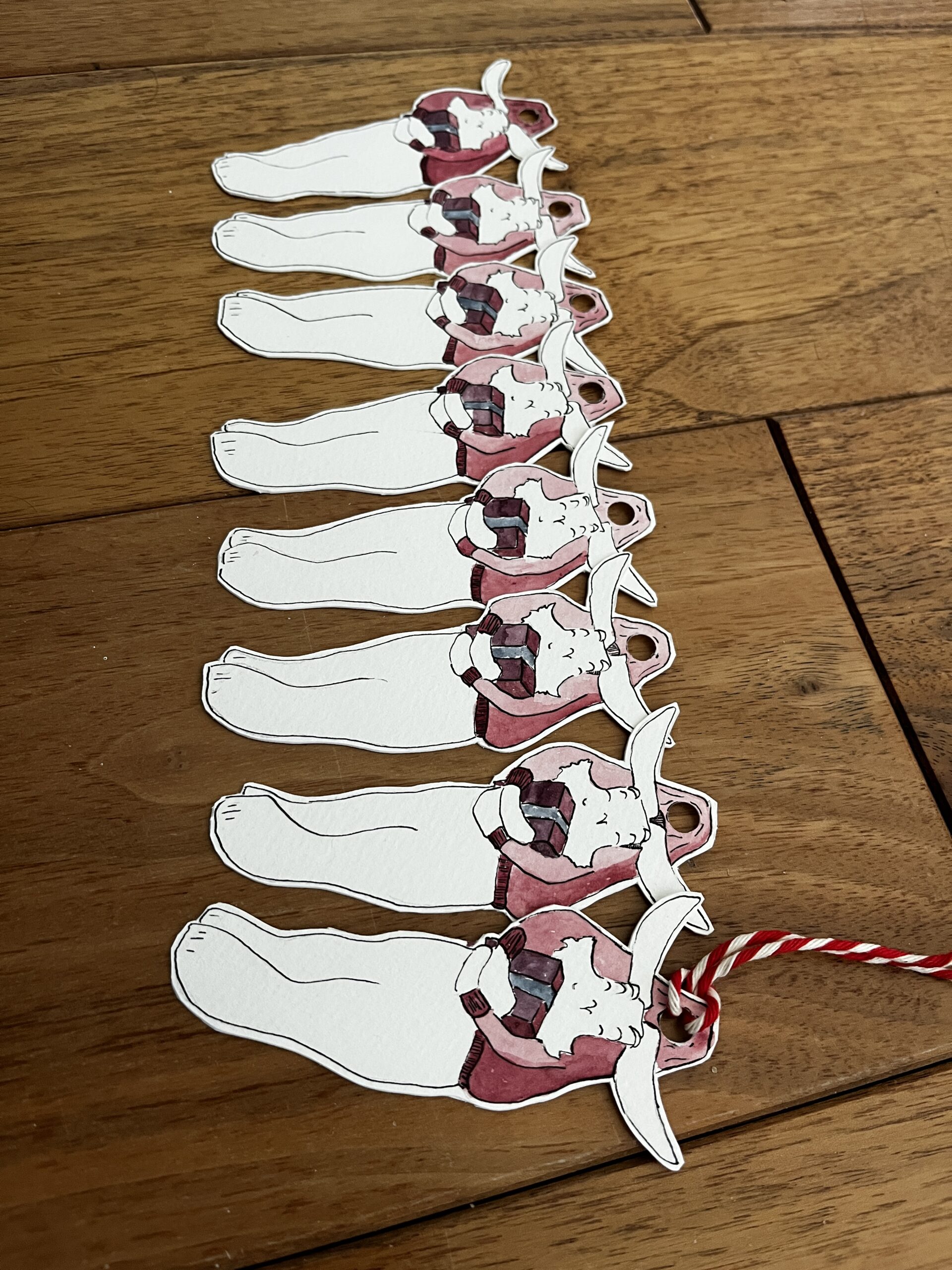 Each gift card has been individually drawn, painted, inked and cut out to give the most unique, humorous Christmas gift cards! Each gift tag comes with its own beautiful red and white baker’s twine!