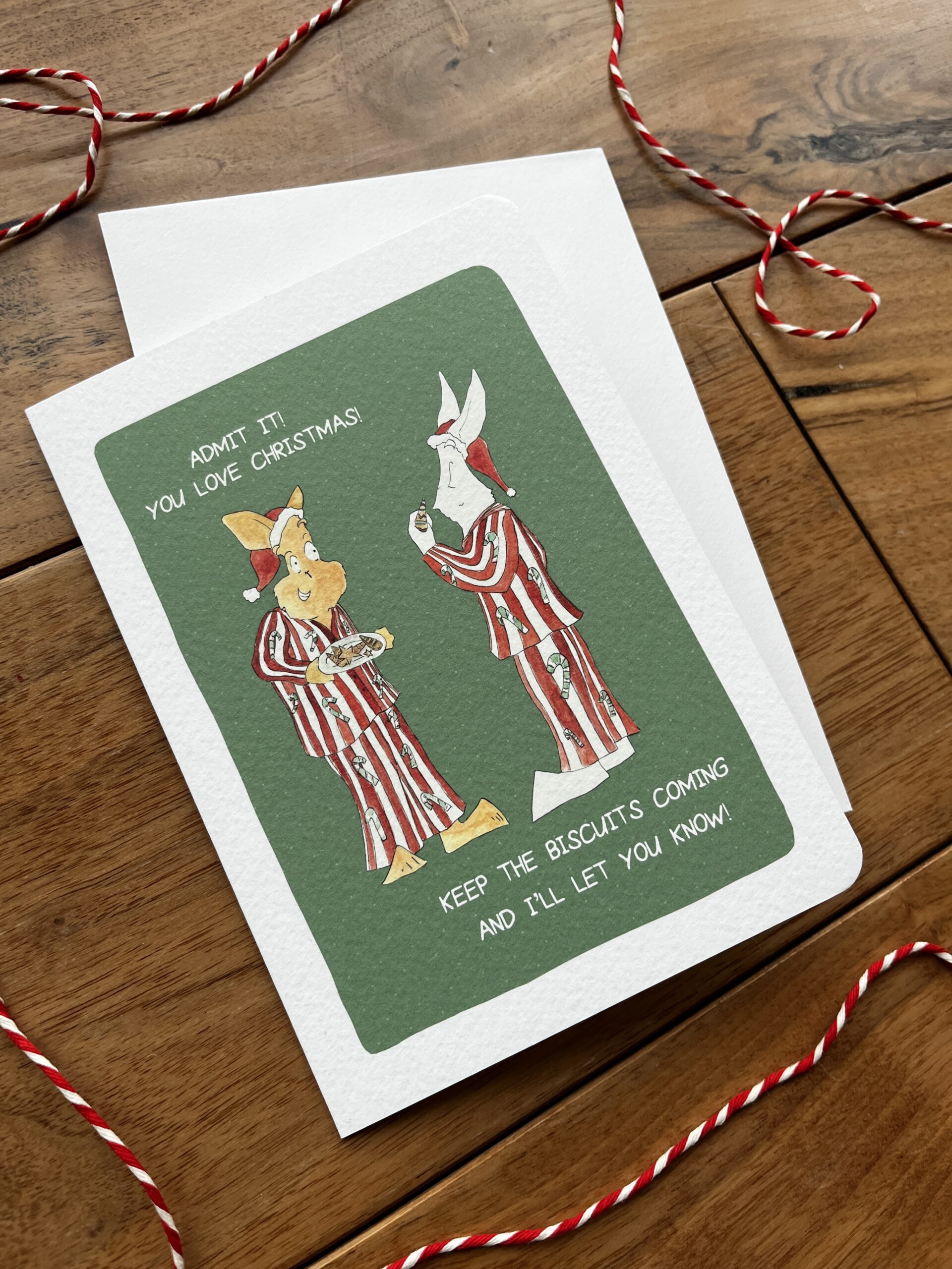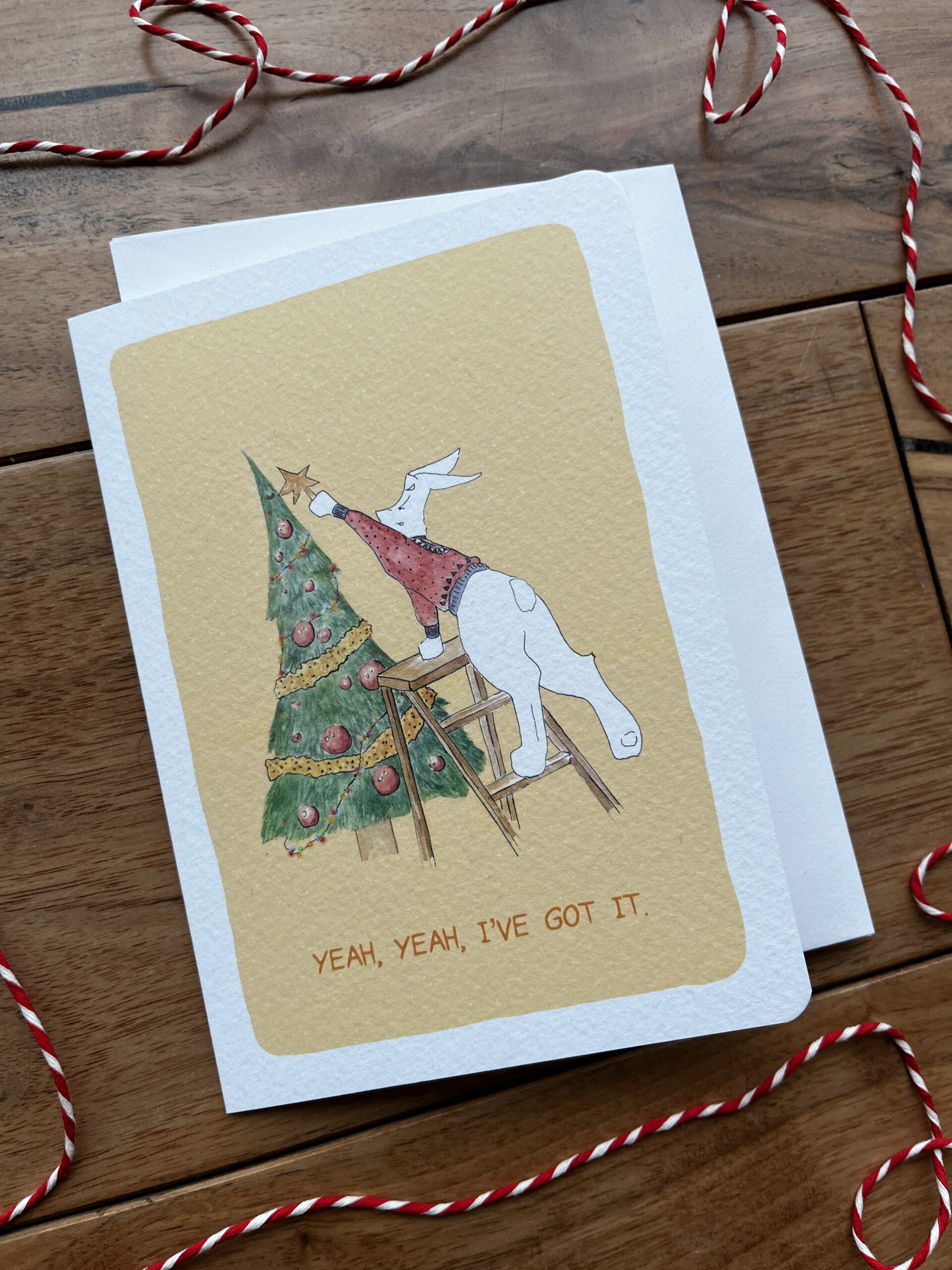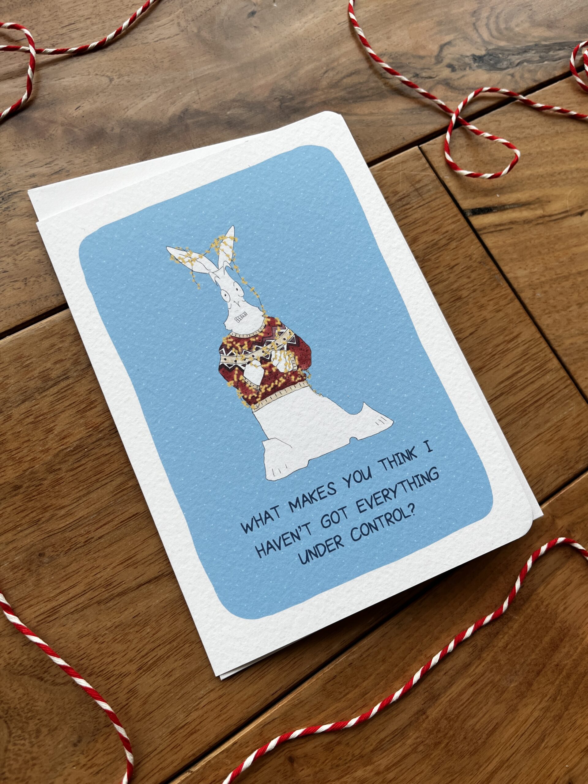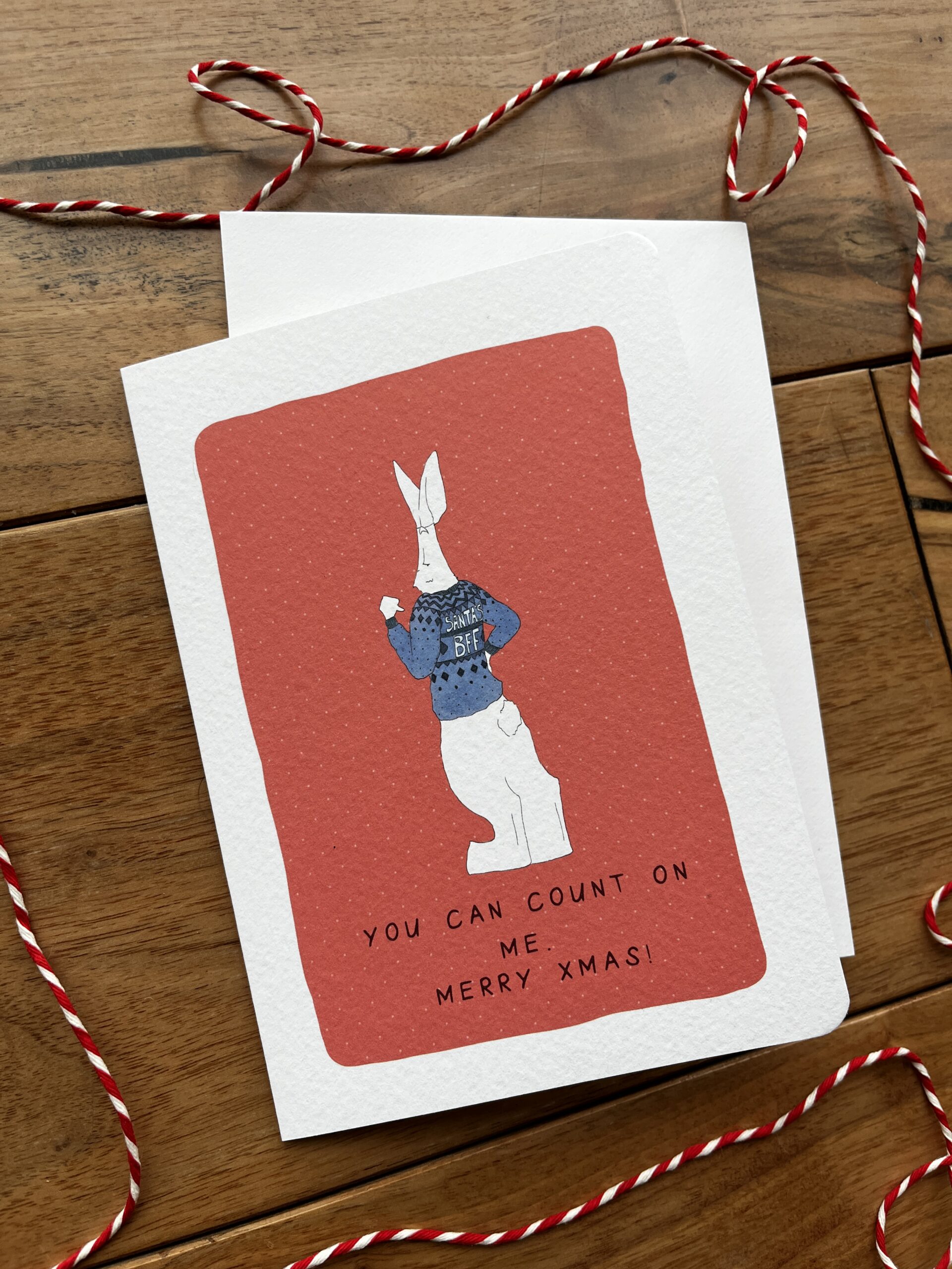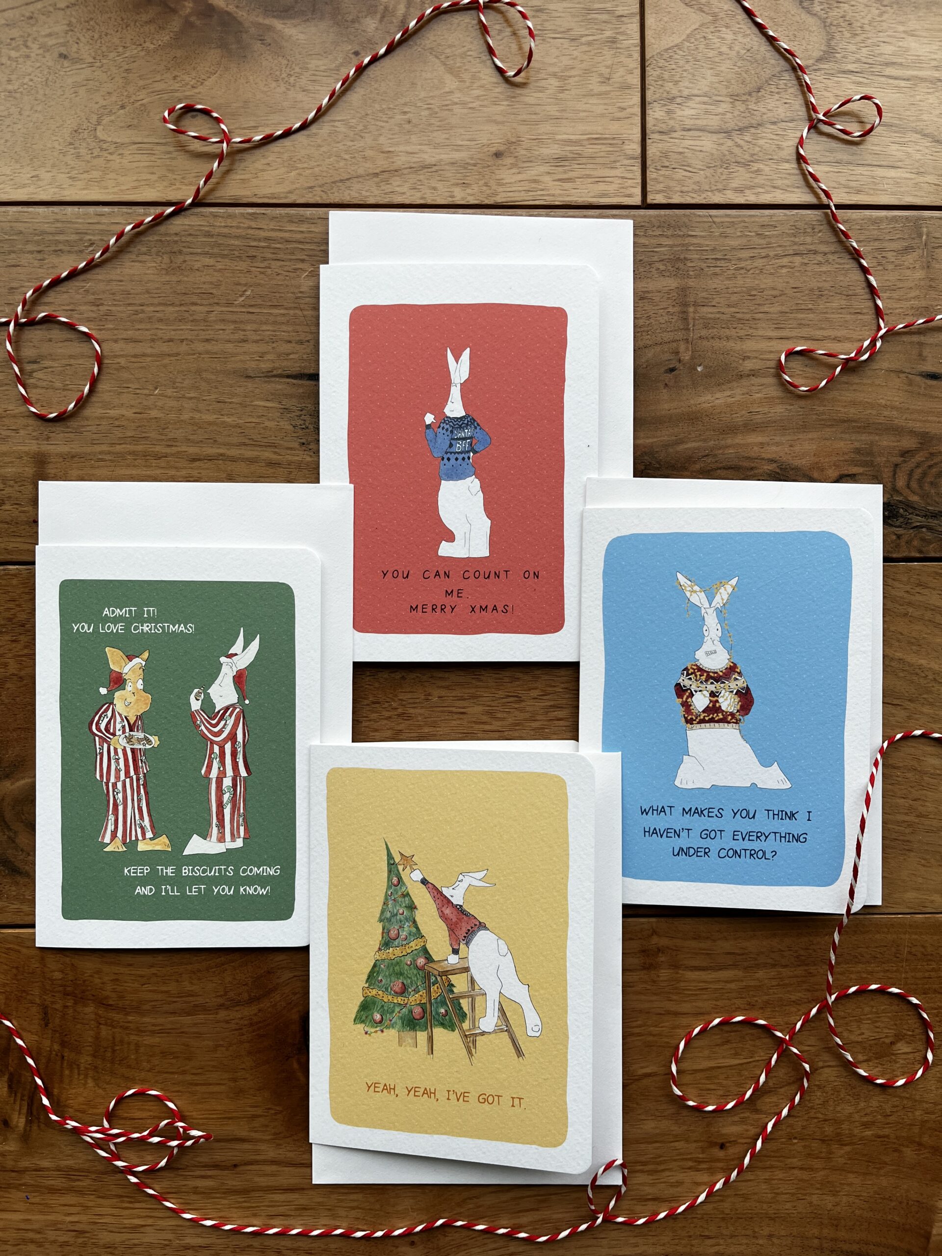 For this Christmas, George the Rabbit presents a set of four small A6 Christmas cards with cute and funny messages to make your loved ones (or enemies you want to impress) smile. The four unique designs were created through a mix of hand painted watercolours characters and digitally drawn backgrounds, and printed on luxury paper (Tintoretto Gesso 250gsm), and comes with a matching white Tintoretto gesso envelope!